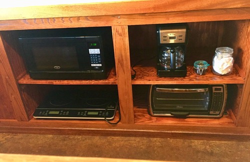 The rental is the entire downstairs with it's own private entrance and large patio with BBQ. The downstairs has two separate bedrooms with a large family room in the middle. The kitchen has a refrigerator, sink, microwave, two burner hotplate, toaster over, and coffee maker. We have a washer and dryer in our house upstairs and can take care of your laundry for a fee if needed.