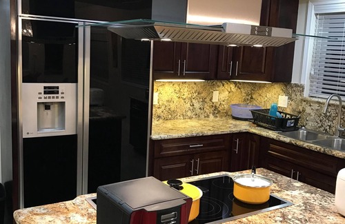The full private kitchen has beautiful island granite countertop with German Gaggenau cooktop. In the kitchen, you are surrounded by Bosch exhausted hood, Bosch dishwasher, Bosch convection oven, Panasonic microwave, and double-wide GE refrigerator/freezer. There are a coffee maker, toaster, blender, plates bowls, spoons, forks, etc. This home has a full-size washer and dryer.