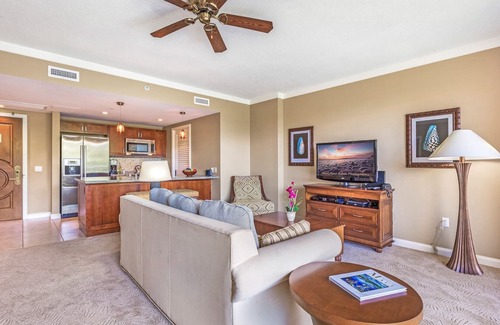 Konea 344 is an expansive one-bedroom suite that offers vistas of the tranquil blue Pacific Ocean and views of Maui's neighboring island of Lanai. You will have plenty of space to relax in the 780 sq. ft. interior because this suite boasts one of the largest one-bedroom floor plans in the entire resort. To fully enjoy the warm Hawaiian breeze, fold away the glass doors to allow the relaxing interior to blend seamlessly with the outdoors.