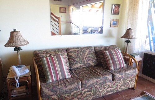 This Condo is located at one of the quietest areas of the complex. It is an upstairs unit with a 20 ft vaulted ceiling, which gives you overall privacy and view. You can see Oahu and Diamondhead in the distance. It is a corner unit which gives you openess with additional view and ventilation. You have an unobstructed view out to the ocean directly in front of you and being a corner unit you have one side free of anyone next door along with additional viewing. This gives for a more private open feeling. Our condo is 2231 in building 23.