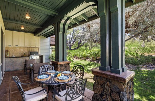 Unit 205 is a 2-story upscale retreat with no one upstairs or down. It is extremely quiet and restful with a private mountain view. This unit offers a downstairs primary bedroom suite and two upstairs bedrooms. Elegantly appointed for comfortable extended stay and spacious enough for entertaining. Enjoy preparing a meal in the outdoor kitchen on your private lanai on the Viking gas barbeque - the perfect place to grill a Parker Ranch steak or fresh island fish. Parking in the attached one car garage is included.