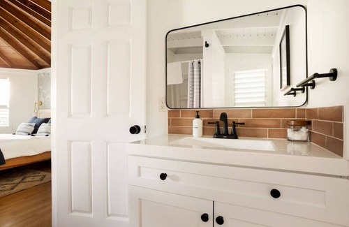 The tranquil bathroom includes updated vanity and flooring with all natural soap, shampoo and conditioner for your use.