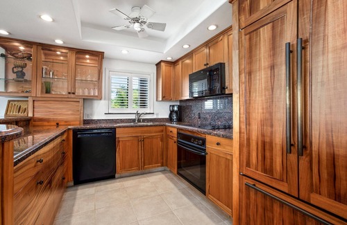 The condo is designed to accommodate up to six guests, making it perfect for families or small groups. Stocked with popular board games, puzzles, and favorite movies, there are plenty of options for in-home entertainment after a day exploring Maui's beauty. The interior features a fully equipped kitchen featuring beautiful koa cabinets, allowing guests to prepare their own meals with ease. Central air conditioning ensures comfort throughout the stay, while the private lanai offers a perfect spot to enjoy stunning sunsets and the soothing sounds of the ocean. A custom-built glass-cube walk-in shower is treat for those looking to rinse off after a day at the beach.