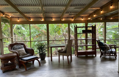 Aloha and welcome to our private banana tree house. Experience a peaceful, unique cottage with spectacular ocean & lush tropical valley views. The cottage floats above and overlooks an operating organic banana orchard. Gated in a 20 acre estate, with majestic royal palms & fruit trees galore. Wrap around screened in lanai & open deck allows guests to soak in gentle trade winds. Enjoy heavenly stars at night & wake to a chorus of Hawaiian song birds serenading you to your new adventurous day.