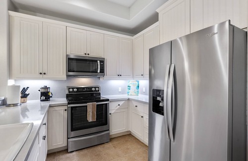 Residence #2003 has been beautifully renovated to provide the perfect combination of luxury and comfort. An open floor plan, tall ceiling, calming color palette, and ample natural light create a relaxing environment for you to call home. The spacious and private lanai is just off the living area and features a dining table and gas BBQ, perfect for enjoying an evening at home. The living and dining areas have been freshly painted with new luxury vinyl flooring and offer plenty of space to enjoy a meal or movie night. A galley style, bright white kitchen includes new appliances and everything you could need for cooking island-inspired meals at home. A thoughtful layout provides many comfortable spaces to spend time together or relax independently.