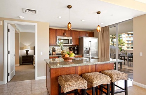 The chef's kitchen is your gourmet home-away-from-home, and your family will create the best memories dining and lounging on the massive 1,100 sq ft lanai with seating for eight with ocean views to the west. It is a partial shared lanai with the next door guests who are the corner.